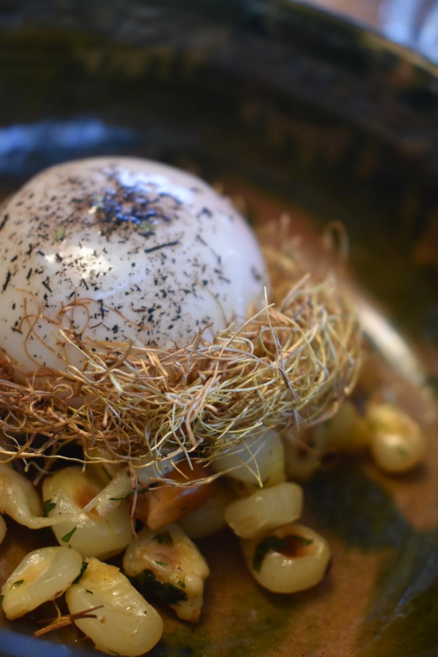 Como entrada caliente y quizás solo para mi uno de los platos estrellas, también quizás uno de los platos icónicos del restaurante, un Choclo con chulpi, huevo pochado y ceniza de choclo, un plato que con la combinación de la yema de huevo era una sensación buena delicada, con texturas variadas con el choclo y el chulpi que te daba una experiencia nueva, un plato como lo digo, icónico dentro del mismo restaurante, tan sencillo pero con tanta historia y raíces dentro de él, como es el uso del choclo en 3 distintas formas, realmente un plato sin igual.