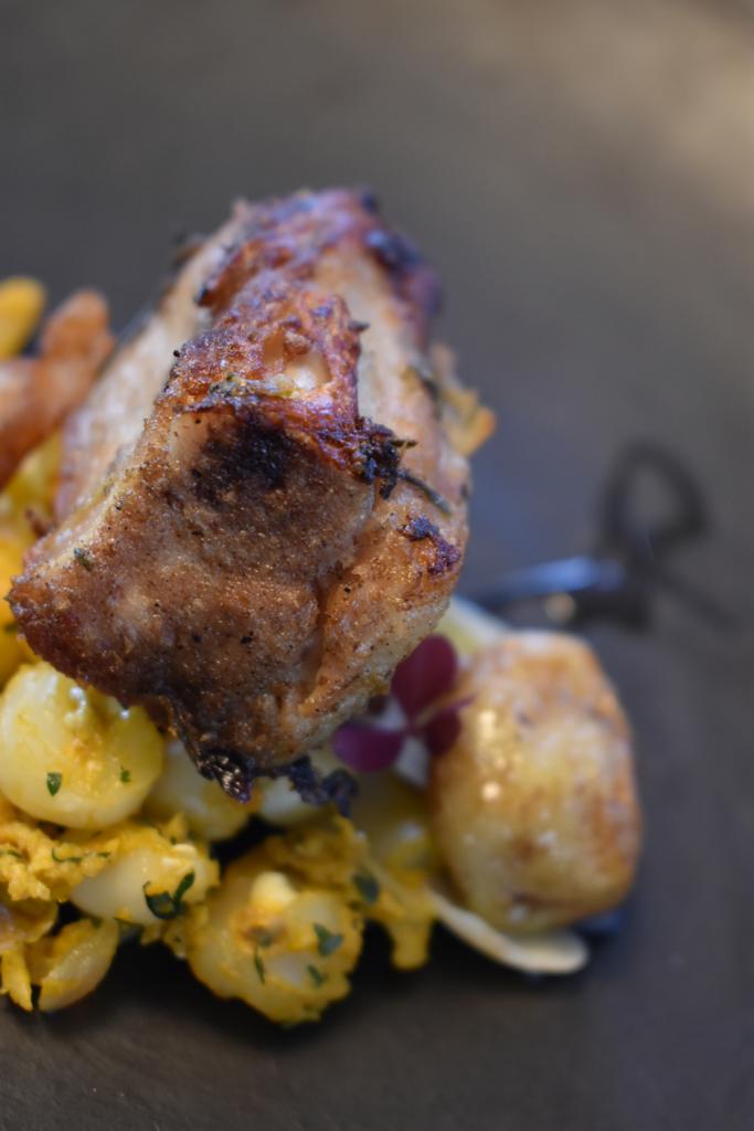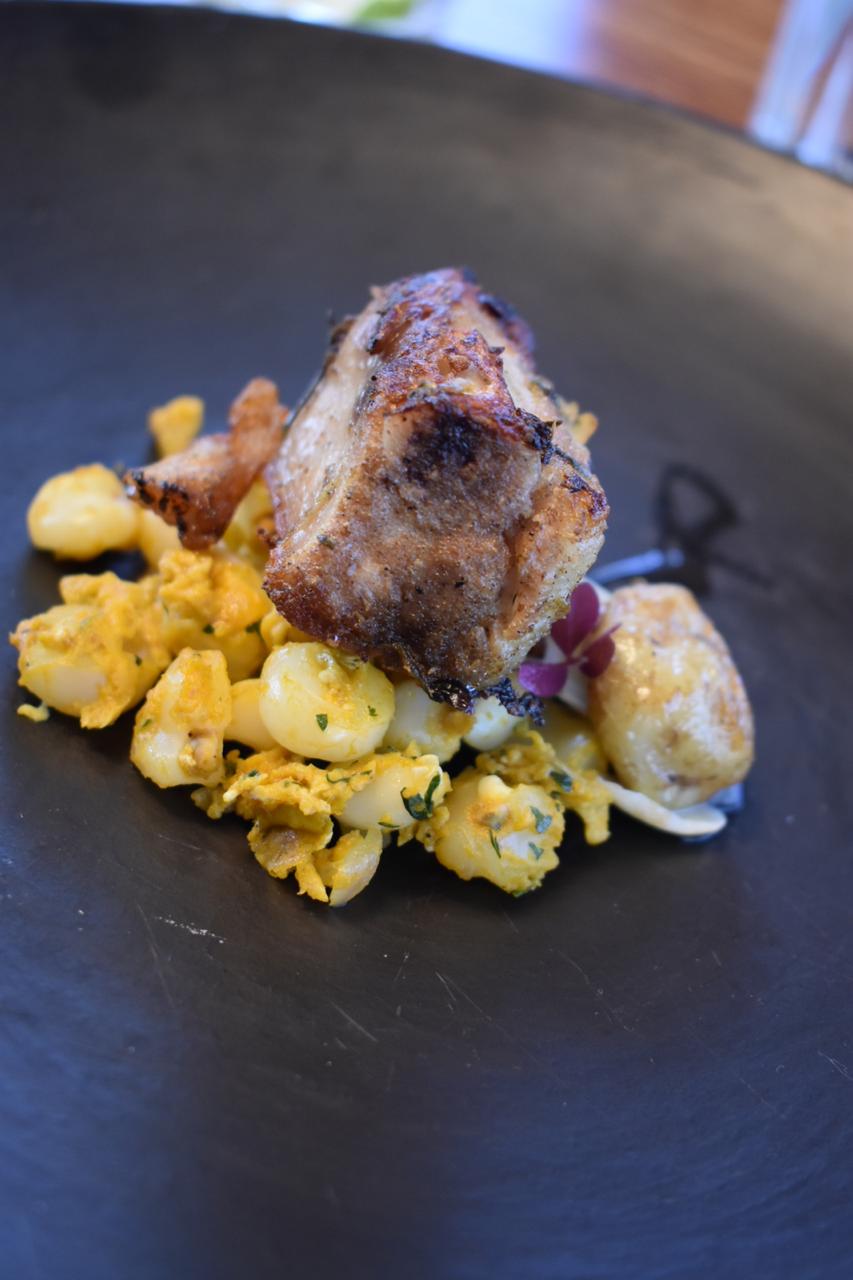 Luego de sorprendernos con semejantes entradas, nos da un 3 paso un Mote pillo con costilla de cerdo marinada y cocinada en sous vide por 24 horas, acompañado de mellocos encurtidos, es complicado llegar a un buen sabor y equilibrio de un mote pillo, aquí estuve satisfecho con el sabor, la cocción muy bien lograda del mote, jugoso y con la combinación suave de la costilla de cerdo, al estar cocinada durante 24 horas en una cocción lenta como es el sous vide, se consigue una combinación inigualable, con una combinación del melloco para cortar sabores salados, un gran plato, sin embargo el melloco con el mote pillo no fue una de mis combinaciones favoritas.