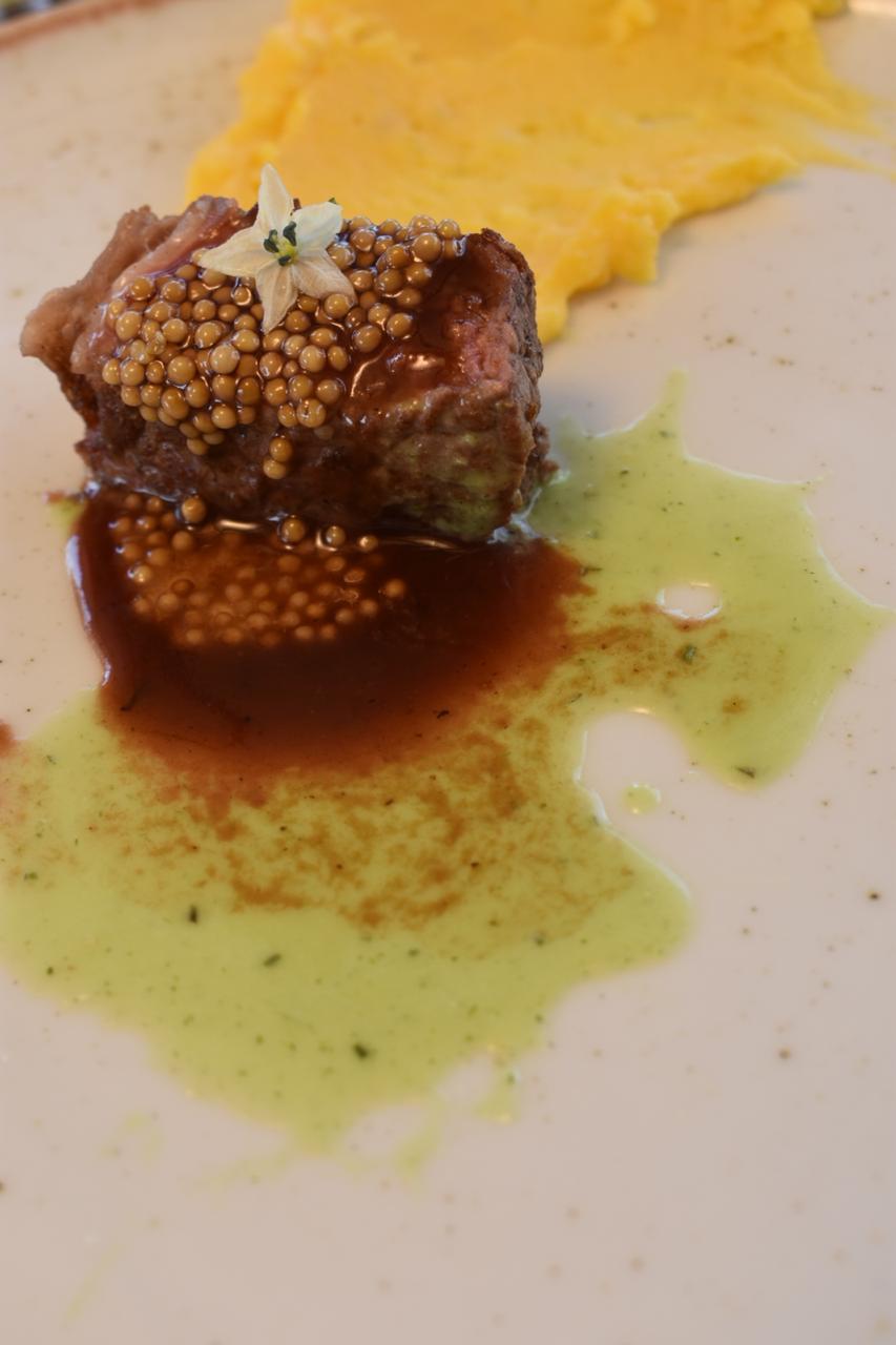 Como segundo fuerte se nos ofreció un bife con puré de papas, vinagreta de hierbas, salsa de chocolate y acompañado de semillas de mostaza en vinagre, el mayor temor aquí, el bife, debido a que es una carne roja, suele ser dura y al ver que no estaba bien cocida, se podría esperar que este con una textura un poco dura, pero no, me sorprendió gratamente al saber que la carne estaba suave, con la combinación de las semillas de mostaza la salsa de chocolate y el puré de papas, dio como resultado una combinación y saber que se en el plato se tiene conocimientos del tema sin igual.
