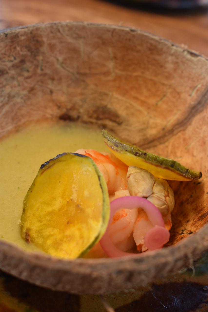 En el menú que nos llegó a ofrecer como una entrada fría se dio a conocer con un ceviche de azar, macambo, cebolla encurtida y camarón, el cual en mi opinión eran sabores que jamás había probado, la acidez del azar combinado con el dulzor con la suave textura del camarón daba una explosión de sabores exóticos, quizás en opinión de otros un poco pasado en la parte de condimentos, pero en mi opinión eran sabores equilibrados que juntos daban una explosión de experiencias y conocimiento dentro de una sola entrada.